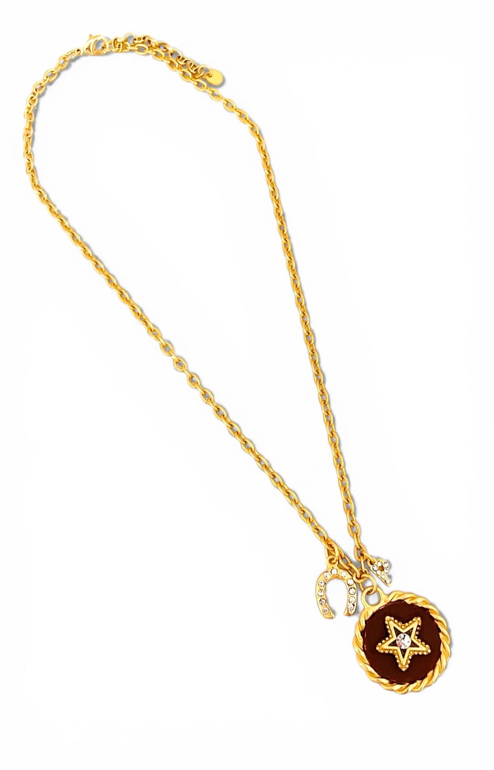 Star with Cristal & Maroon Hand Painted Enamel 🎨 with HorseShoe & Initial ✨Short Necklace on Camila Chain (Only Available In Store)